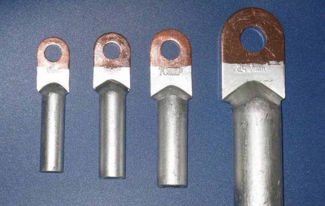 Важно. Для оконцевания алюминиевых проводов следует использовать переходники из такого же материала. Это правило распространяется и на медные жилы. Прямое соединение меди с алюминием недопустимо.