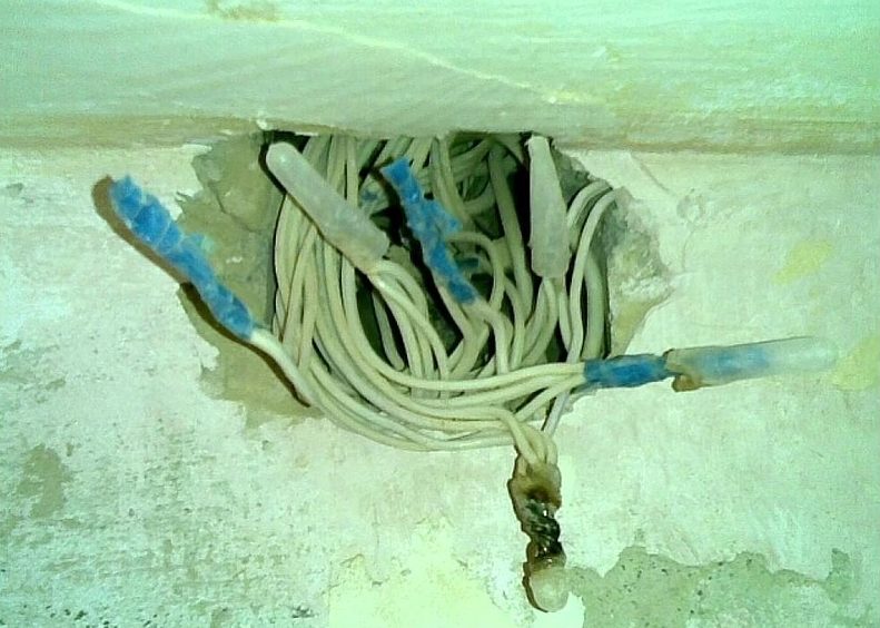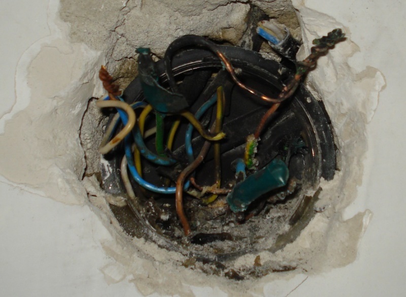 Часто неисправность кроется в обрыве кабеля в стене. Такое случается после сверления. Бур от перфоратора попадает в кабель и повреждает изоляцию фазы, нуля и земли.