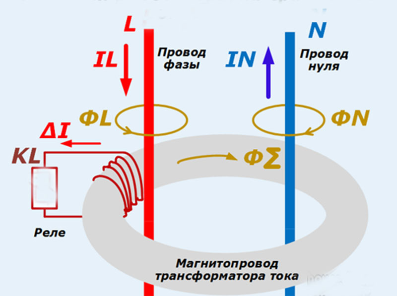 Под проблемой подразумевается состояние, когда токи в фазном и нулевом проводниках неравны. Для сравнения этих показателей в УЗО предусмотрен специальный дифференциальный трансформатор. Его первичными обмотками являются фазный и нулевой провода, через которые ток поступает в квартиру. Они включены в противофазу. При одинаковых токах обмотки создают равные по модулю, но противоположные по направлению магнитные потоки. Их геометрическая сумма равна нулю. При неодинаковых токах магнитные потоки отличаются и наводят ЭДС на вторичную обмотку трансформатора. Сигнал вторички поступает на контроллер схемы, а с него на исполнительный орган — электромагнитное реле. Оно отключает выходную L клемму УЗО от входной.