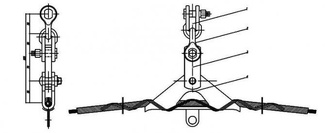 Крепление этого зажима к опоре осуществляется через скобу и линейную сцепную арматуру.