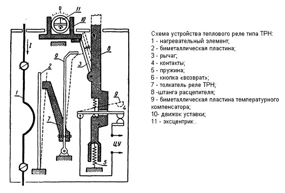 Термопластины изготовлены из двух металлических сплавов с различной теплопроводностью, которые при нагреве/охлаждении меняют свою геометрию. Это свойство биметаллических элементов заложено в принцип функционирования теплового расцепителя. При любом увеличении или уменьшении тока нагрузки, рабочие пластины меняют свое пространственное расположение и механически воздействуют на толкатель, который размыкает или замыкает контактные группы термореле, подключенные к обмоткам магнитного пускателя (МП). Пускатель двигателя срабатывает и отключает нагрузку от электрической сети. Стандартная конструкция электротеплового реле представлена на следующей картинке.