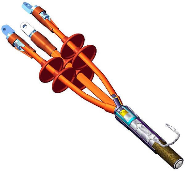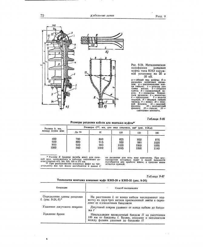 Это наиболее частый способ изолирования трехжильного проводника с помощью концевой кабельной муфты. По конструктивному исполнению разделяются на однофазные и трехфазные соединители. Например, однофазная КНО-20, применяется для изолирования конца кабеля напряжением 20-25 кВ, имеющего бумажную изоляцию с металлической оболочкой для каждой жилы.