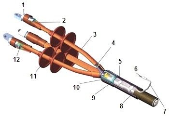 1 — Наконечник 2 — Изоляция наконечника 3 — Изоляция жилы 4 — Трубка маслоотделительная 5 — Герметик 6 — Наконечник 7 — Провод заземления 8 — Изоляция узла заземления 9 — Герметик 10 — Перчатка 11 — Изолятор (Юбка) 12 — Герметик