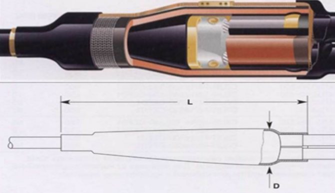 Концевые муфты используют соответственно для оконцевания кабеля. По сути своей это обычная заглушка в виде колпачка. Как пример такого изолятора можно рассмотреть строительный изолятор СИП. Подобно изоляции скрутки проводов квартирной проводки их применяют для линий связи и электросетей. Или их еще используют при разделки многожильных кабелей. Как например на этом рисунке: