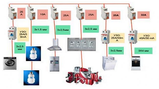 В итоге схема подключения кухонной техники к щитку питания будет выглядеть примерно так.