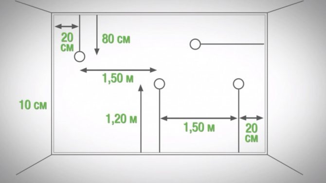 Внутри потолочного перекрытия можно организовать общую линию, тогда на стены будут выходить только ответвления для розеток и выключателей. В местах поворота кабеля и соединения проводов в распределительной коробке делают выпуск максимум 150 мм от потолка под прямым углом.
