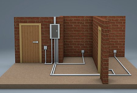 - Скрытую проводку чаще всего применяют в строениях, выполненных из несгораемых материалов. В этом случае провода можно прокладывать непосредственно по стенам конструкций с последующим оштукатуриванием.