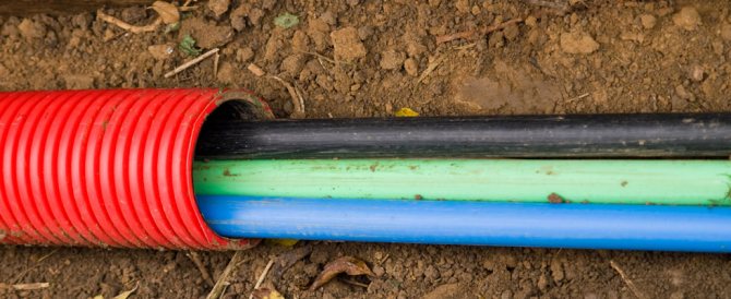 - Проводка вне зданий может быть смонтирована воздушной или кабельной линией. Воздушные линии на садовом участке монтировать достаточно хлопотно, да и не очень красиво. Поэтому в большинстве случаев прибегают к кабельной разводке под землей.