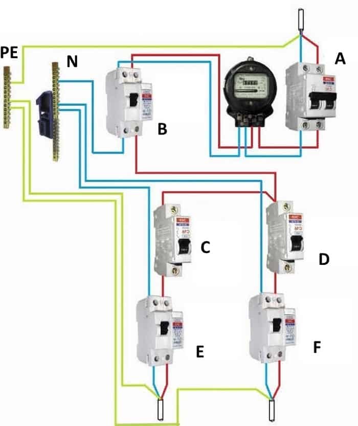 В данном случае все просто, на вход устанавливается АВ (А на рис. 7) с номинальным током 40 А. После него стоит общее устройство (В), его еще называют противопожарным. У данного устройства ток утечки должен быть не менее 100 мА, номинальный ток, как минимум – 50 А (см. пункт 2 общих правил, указанных выше). Далее идут две связки УЗО-АВ (С-Е и D-F). Параметр номинального тока у «С» и «D» — 16 A. Для «E» и «F» это параметр должен быть на ступень выше, в нашем случае – это 20 А. Что касается величины отключающего тока, то для влажных помещений этот показатель должен быть 10 мА, для остальных групп потребителей – 30 мА.