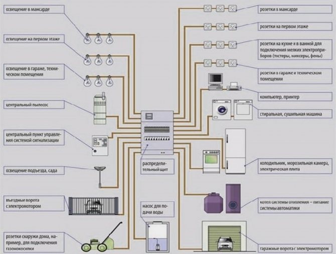 Все линии проводов и кабелей подходят к электрическому распределительному щиту. Для каждой из них устанавливается автоматический выключатель соответствующей мощности и если необходимо УЗО (устройство защитного отключения). Электрощит является неотъемлемой частью всей системы внутренней проводки и его необходимо включать в принципиальную схему электроразводки в частном доме, квартире или на даче. Для частного дома, возможно, потребуется включить в схему электропроводки стабилизатор напряжения, так как параметры электрического тока, очень часто бывают нестабильными.