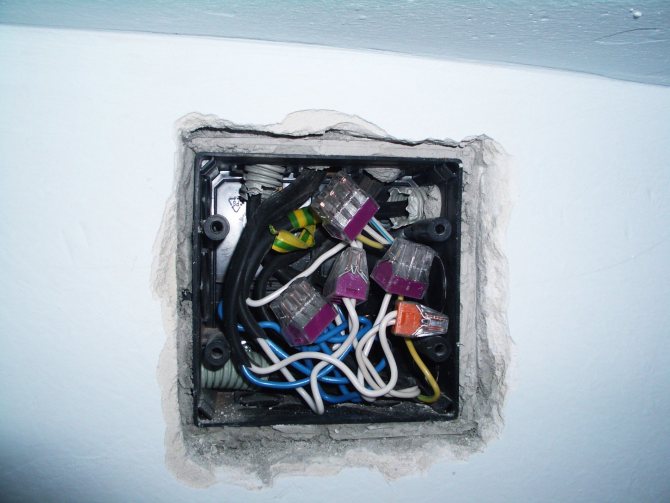 - Дозовая коробка. От щитка идет кабель на каждую дозовую коробку, размещенную между потолочными балками. В свою очередь от этих коробок по одному проводу отходит на выключатель света и по одному непосредственно на патрон.