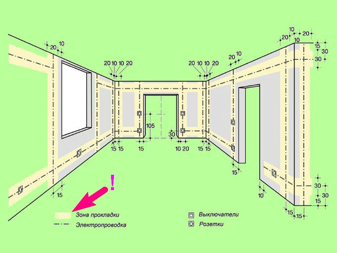- Трасса электропроводки должна проходить по верху стены на высоте не менее 2 (в случае возможности поражения током — 2,5 м) от пола, но не ближе, чем 200 мм к потолку.