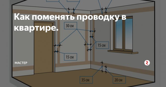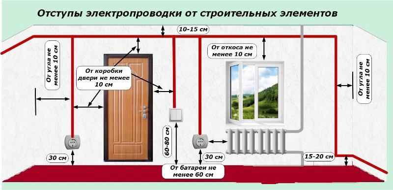 - Если высота помещения недостаточна, трассу можно прокладывать в стенах на высоте порядка 200 мм от пола или в трубах. Это требование не относится к проводам, идущим к розеткам или выключателям.