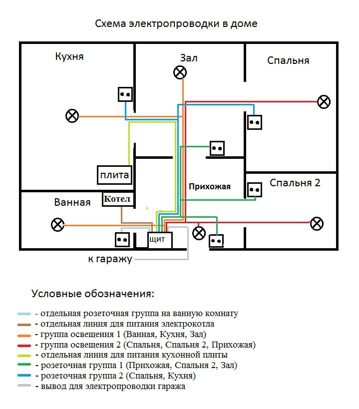 Разрабатывая принципиальную схему электроразводки в частном доме, следует знать, что современные СНиП обязывают исполнителя планировать проводку раздельно по комнатам, с разделение линий розеток и осветительных приборов. Это связано с требованиями безопасной эксплуатации электрических сетей. К тому же по комнатное разделение внутренней проводки более удобно в эксплуатации. При проведении ремонтных работ нет необходимости обесточивать весь дом, достаточно отключить от сети одну комнату.