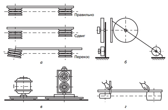 Рис. 6. Выверка валов при ременной и клиноременной передачах с помощью: а — выверочной линейки; б — скоб и струны; в — шнурка; г — при шкивах разной ширины