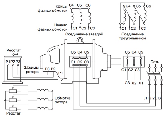 Рис. 7. Схема соединения обмоток и включения в сеть асинхронного электродвигателя с фазным ротором