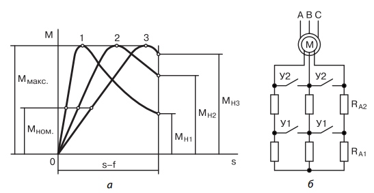 Рис. 8. Пуск трехфазного асинхронного двигателя с фазным ротором: а — графики зависимости вращающего момента двигателя с фазным ротором от скольжения при различных активных сопротивлениях резисторов в цепи ротора (цифры 1, 2, 3 —