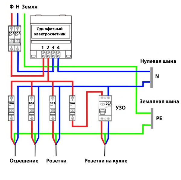 После электросчетчика фазовый провод идет на разветвитель, УЗО и пакетники, отвечающие за включение — выключение отдельных веток электропроводки, нулевой провод выводятся на контактную колодку, от которой проводка разводится по всему дому. По окончании установки шину заземления подключают к корпусу ящика.
