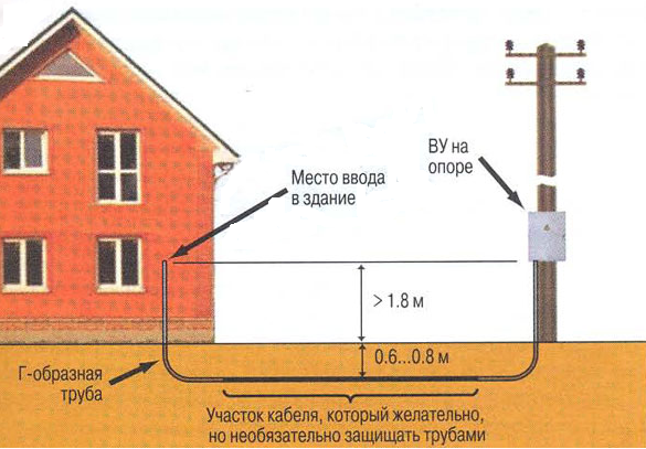 Если вы согласились на выносной вариант установки шкафа с электросчетчиком, как вы дальше будете заводить кабель в дом, уже никого не волнует. Можете установить опоры или зарыть на глубину 0,7-0,9 м, как требуют правила. Нужно только сделать панель с пакетниками для отключения отдельных сегментов проводки и оборудовать заземление.