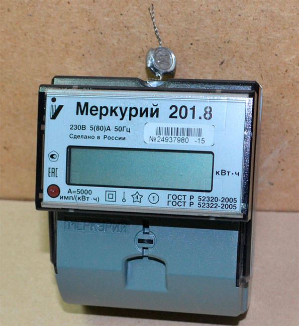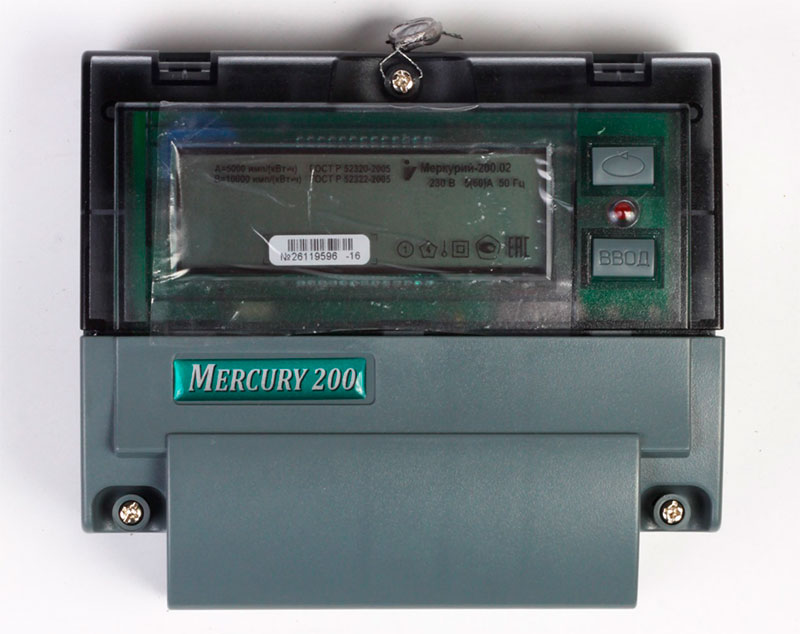 Меркурий 201.8 – современная модель с 7-разрядным жидкокристаллическим экраном. Отличается характеристиками с повышенными эксплуатационными возможностями: при измерении активной энергии класс точности составляет 1,0; напряжение колеблется в пределах 220÷230 В; сила тока от номинального до максимального – 5÷80 А; рабочая температура находится в диапазоне от ‒45 до +75 °С; максимальная влажность – 90%. К особенностям принадлежат: модульный корпус, винтовые клеммы, измерительный преобразователь тока. На «посадочное место» устанавливается с помощью практичной DIN-рейки. Для удобства считывания показателей предусмотрена светодиодная подсветка.
