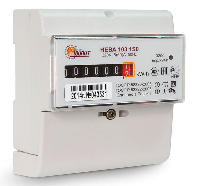 Нева 103 1SO – сертифицированная модель с 7-разрядным отсчетным устройством механического типа. Характеризуется: напряжением 220/230 В, силой тока 5/60 А, рабочим температурным диапазоном от ‒40 до +60 °С, классом точности 1,0, 16-летним интервалом между поверками.