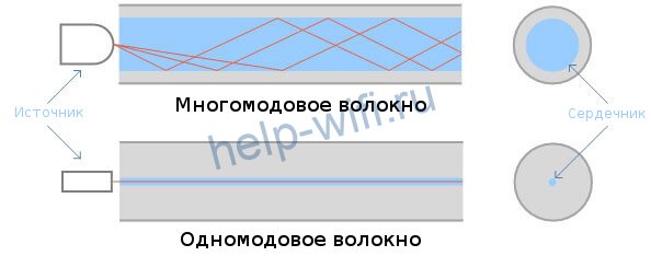- Одномодовое волокно (SMF) имеет гораздо меньший диаметр сердцевины – 8,3 мкм или 9 мкм и единственный световой путь, который может проходить на большие расстояния. Одномодовые волокна обычно используются для более длинных участков, таких как сети передачи данных университетского городка, передачи кабельного телевидения и телекоммуникационные сети.