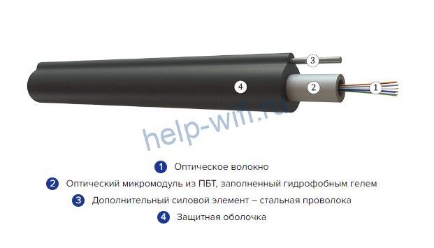 В зависимости от сценария использования кабеля, его конструктивные особенности могут меняться, но общий принцип остается один. Для понимания расположения элементов оптоволокна кабеля, фото в разрезе окажется наиболее удобным способом продемонстрировать их на самом распространенном примере: