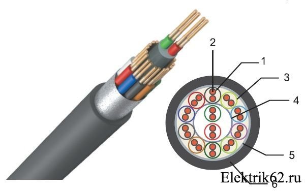 ТППэп: 1 — жила; 2 — полиэтиленовая изоляция; 3 — сердечник; 4 — скрепляющая обмотка; 5 — поясная изоляция; 6 — экран