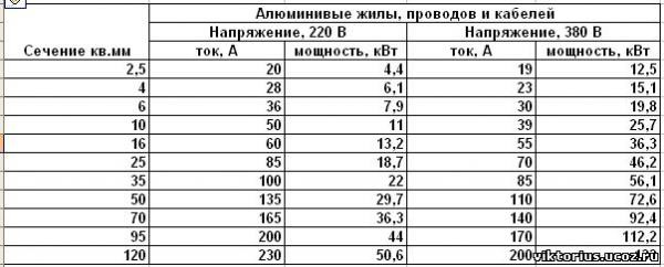 Так же как и в случае с медным кабелем, проведем сравнение алюминиевого по сечению, силе тока и мощности. Опять-таки, не будем рассматривать все, возьмем только ходовые параметры.