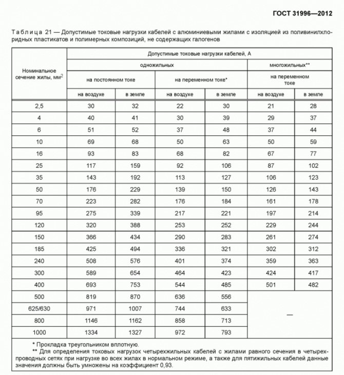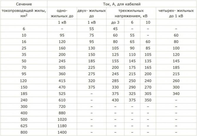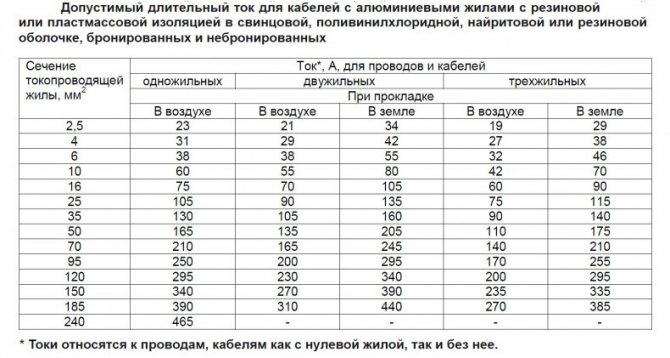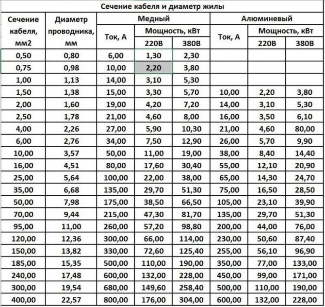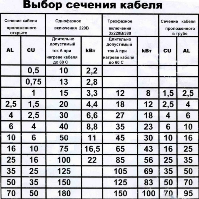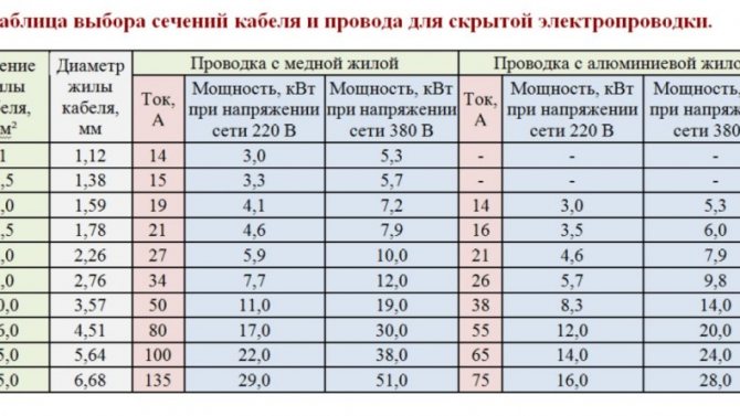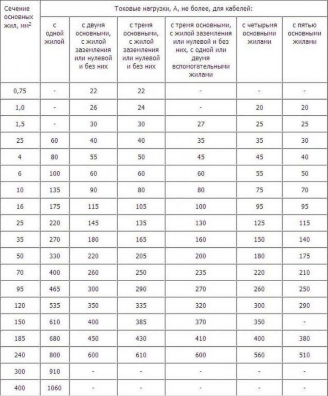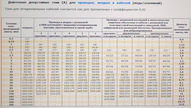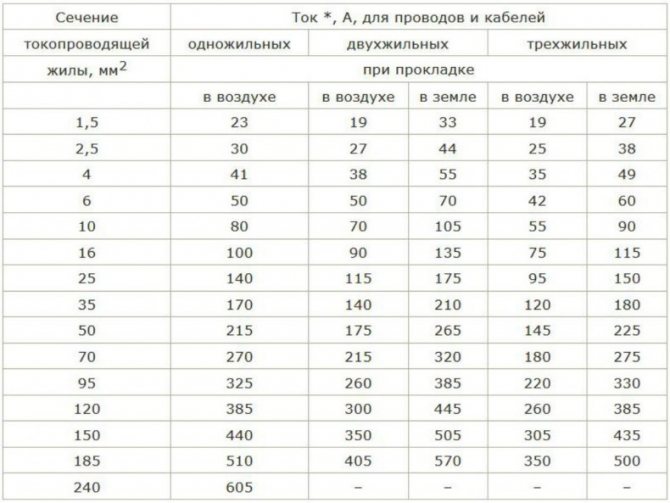 После проведенных вычислений, смотрим в таблице для правильного расчета сечения проводов наиболее близкий по значению проводник с необходимым сечением жилы.