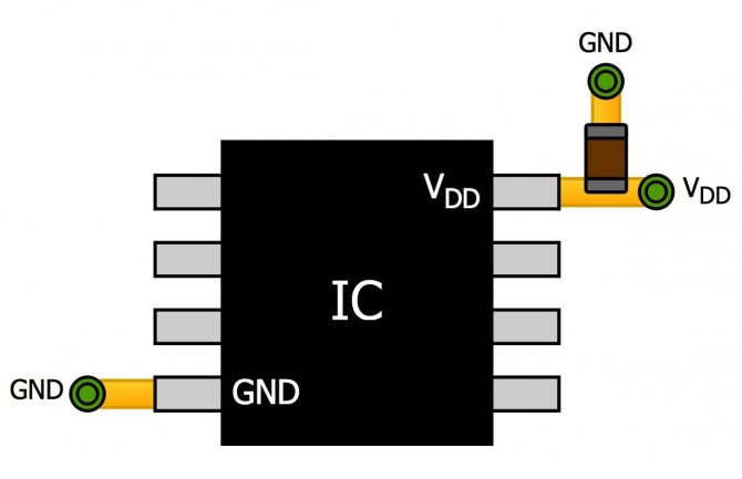Использование сквозных отверстий на полигоны земли и шины питания при размещении блокировочных конденсаторов