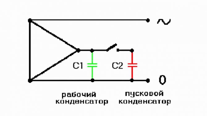 Если электродвигатель должен запускаться при наличии высокой нагрузки на приводном валу, то рабочий конденсатор не справится, и на время запуска потребуется подключать пусковой. После достижения рабочих оборотов, что происходит в среднем за 2-3 секунды, он отключается вручную или устройством автоматики. Доступны специальные кнопки включения электрооборудования, автоматически размыкающие одну из цепей через заданное время задержки.