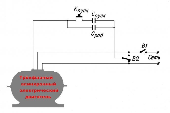 При другом способе для преобразования питающего напряжения используется обмотка самого асинхронного электродвигателя. Схема получится громоздкая и массивная. Конденсатор для запуска электродвигателя подключают по одной из двух популярных схем
