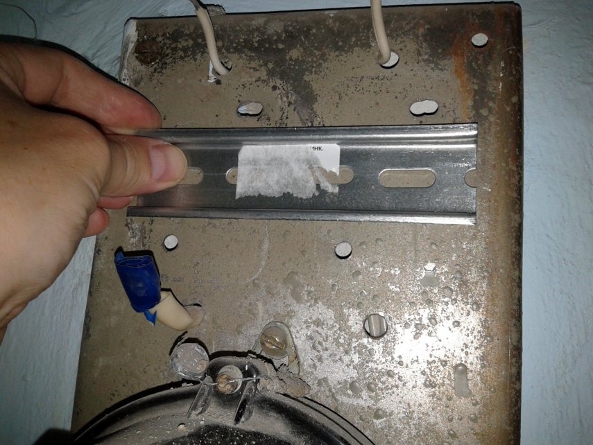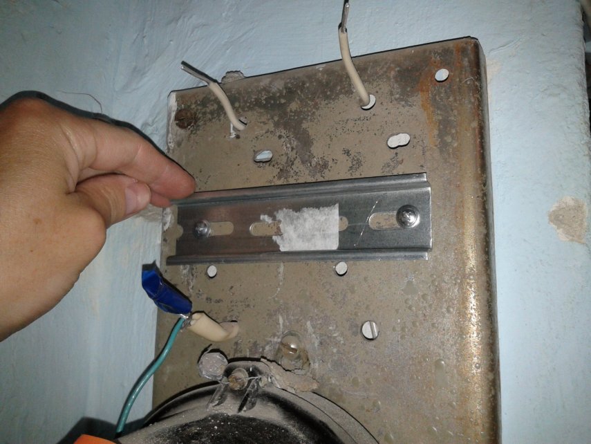 - Установить на их место DIN-рейку. Предварительно ее нужно обрезать, чтобы она соответствовала по размеру выключателю. К дереву или металлу крепление производится с помощью шурупов, а при работе с бетонной стеной нужно использовать дюбеля.