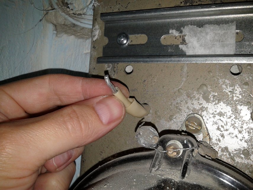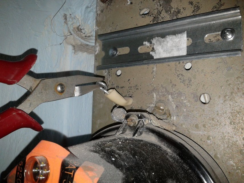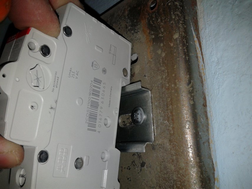 Когда это практически удалось сделать, выкручиваем его обратно, и продев в прорезь дин рейки, снова зажимаем.