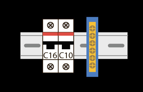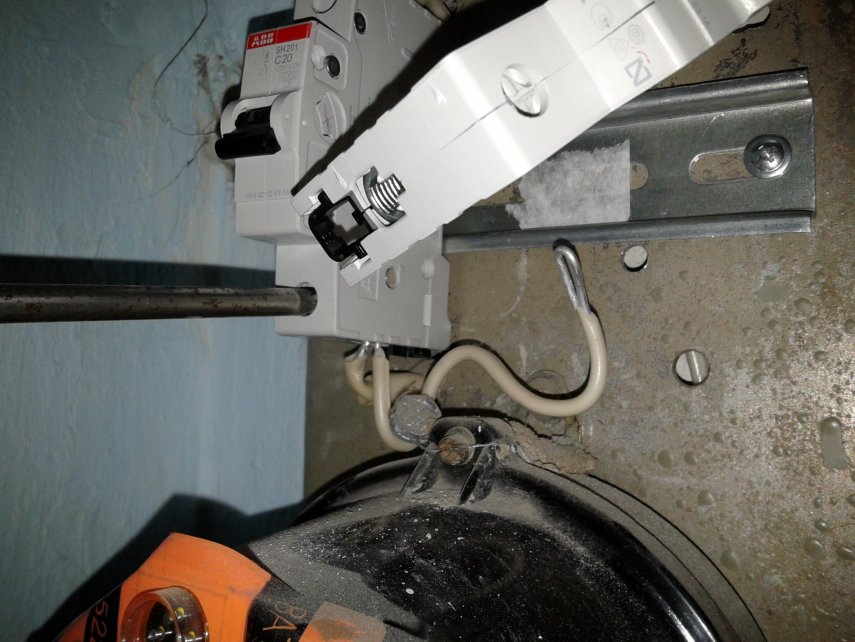 - После того, как проводники подсоединены, защитный выключатель ставится на DIN-рейку.