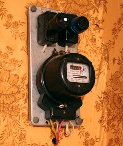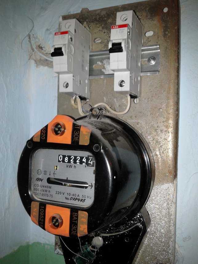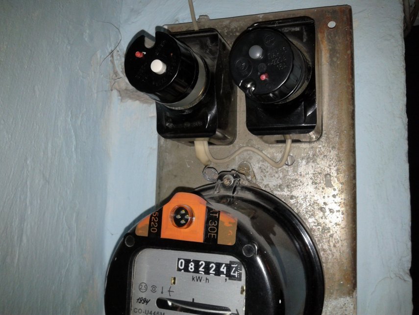 Счетчик с пробками установлен внутри квартиры на пластиковой подставке. Электропроводка алюминиевая. Моя задача как электрика заключалась в модернизации узла защиты — замене старых советских пробок на современные автоматические выключатели.
