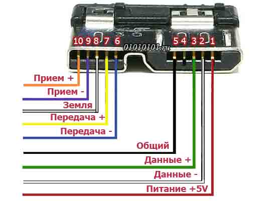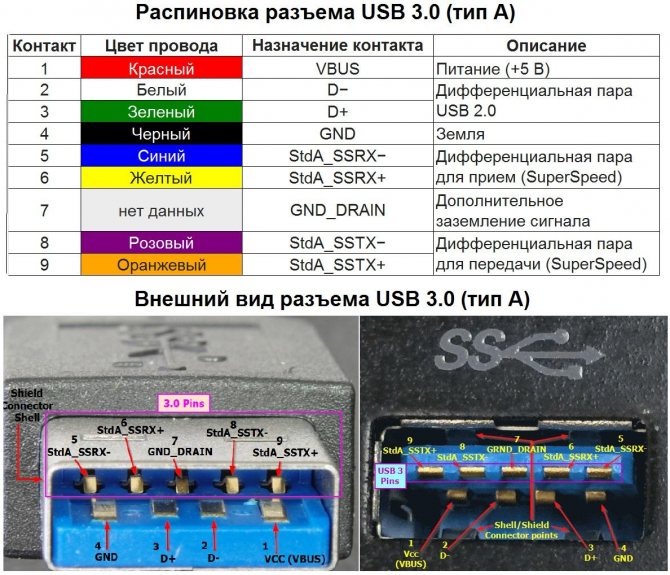 Распиновка USB 3.0 разъема выглядит следующим образом: