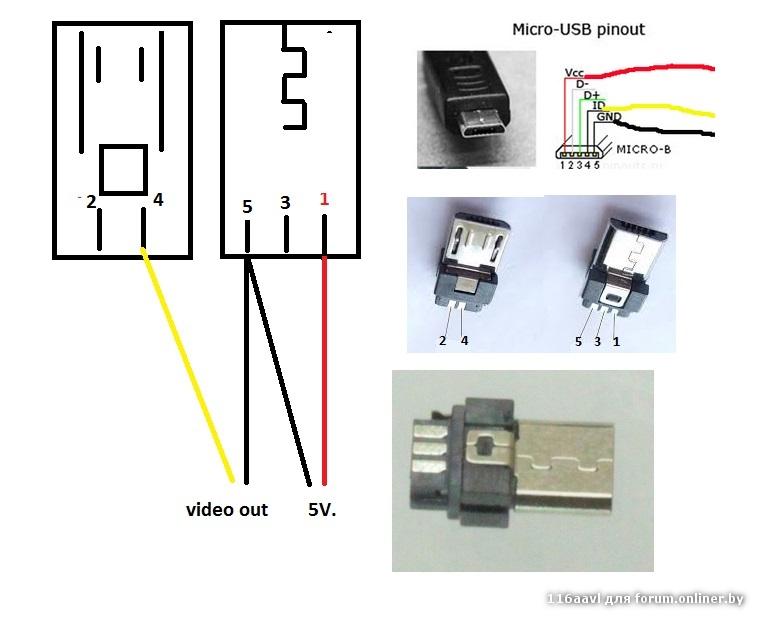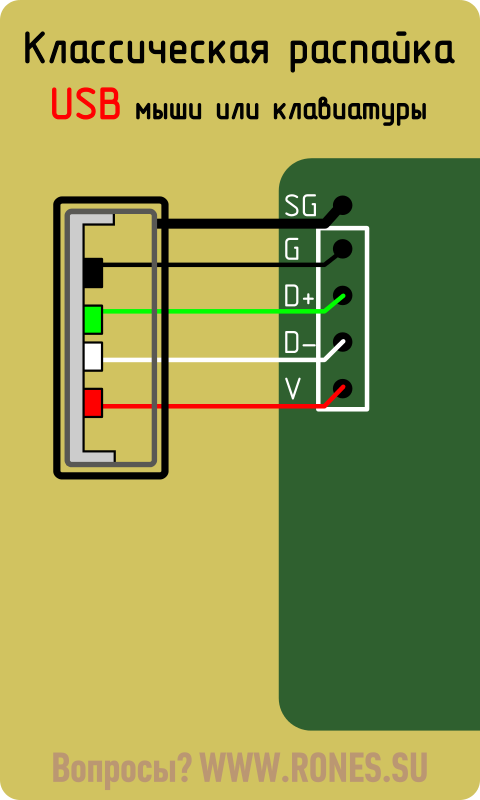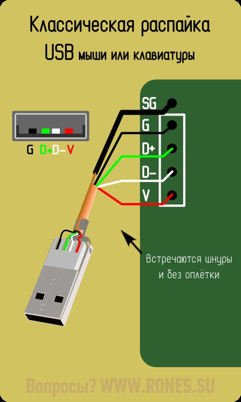 В случае с устройствами USB буквенные обозначения будут: V, D-, D+, G (не обязательно в таком порядке). Может присутствовать точка для пайки оплётки кабеля — SG. Классические цвета в USB шнуре таковы: