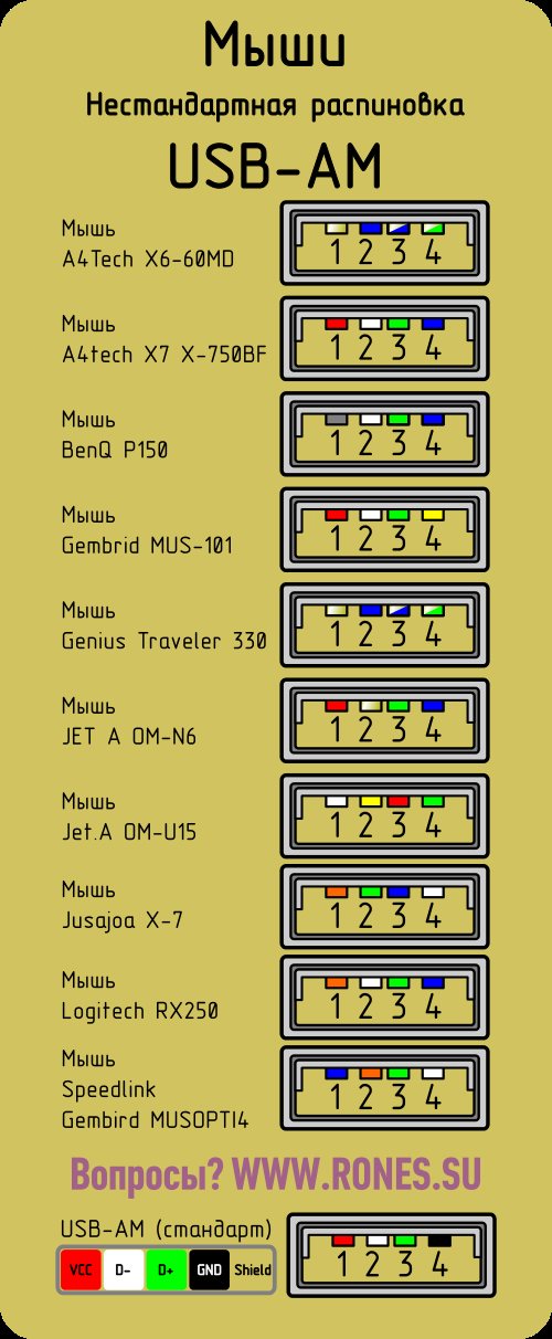 В шнурах USB устройств цвета проводов могут отличаться от стандартных. Тогда вам может помочь статья «Нестандартные цвета USB в шнурах мышей и клавиатур».