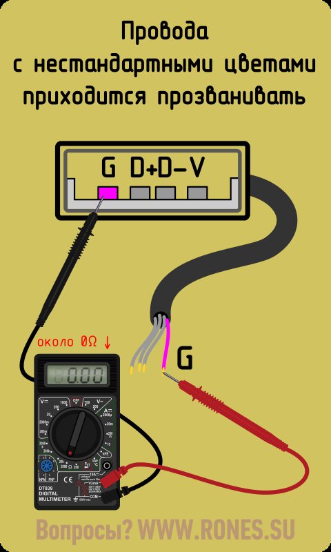 Если информации по вашему устройству нет в статье, придётся прозванивать шнур самостоятельно. Назначения контактов штекера USB определено чётко (см. рисунок↓), остаётся лишь выяснить, с каким цветом каждый контакт звонится. На рисунке приведён пример определения провода «G». Лишь с одним из четырёх проводов мультиметр в режиме омметра покажет около нуля Ом. Это и есть искомый провод. Такое исследование следует повторить с остальными контактами.