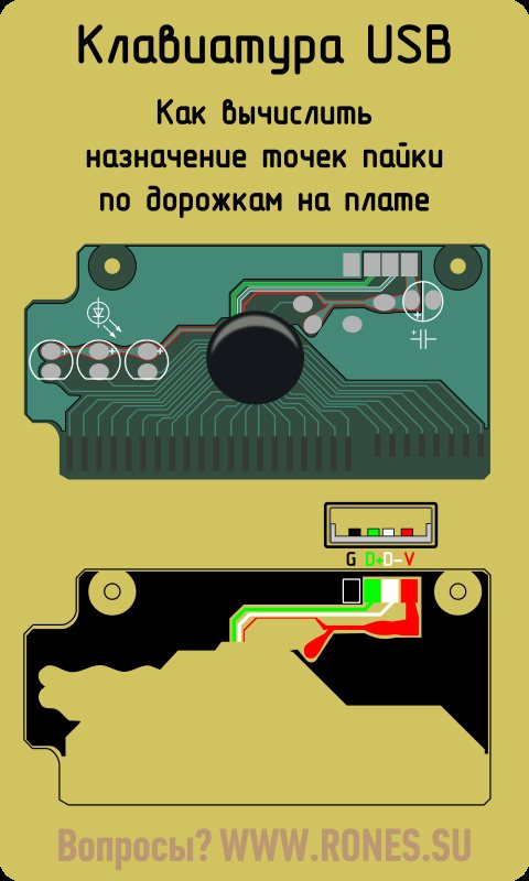 • Две самые короткие и фактически одинаковые дорожки на плате — это D- и D+ (D и C в случае с устройствами PS/2). Они без лишних разговоров идут к микросхеме контроллера. Кто из них кто — определяется экспериментальным путём. Касаемо этих контактов эксперименты безопасны.