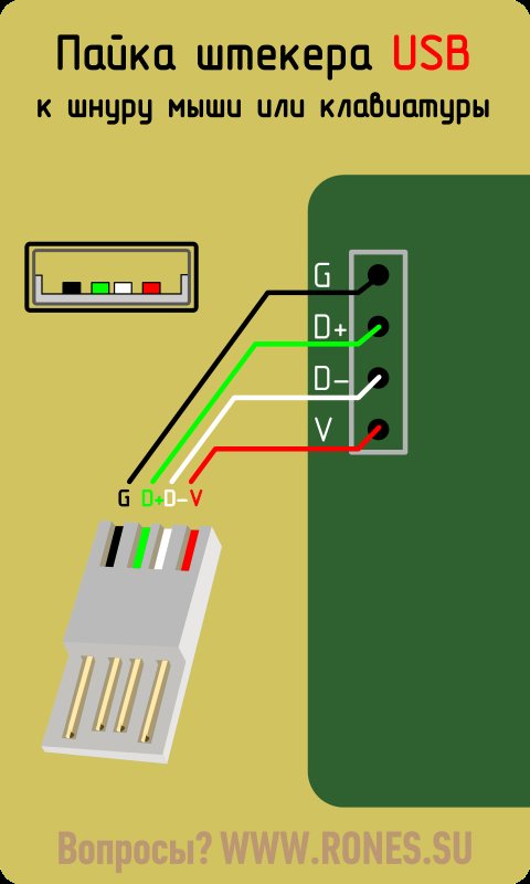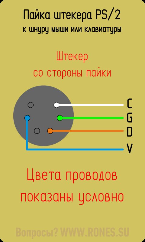 Если же собака или младшая сестра отгрызла штекер от мыши или клавы, покупаете новый разъём и паяете на шнур по классической схеме.