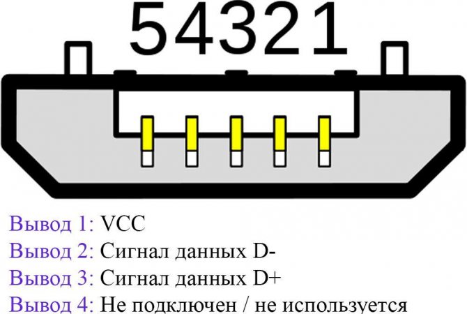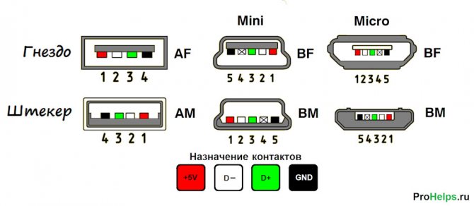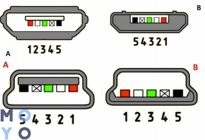 Уменьшенные порты — пятиконтактные. Микро — стандарт для большинства гаджетов. Они отличаются миниатюрными габаритами, мини — как уже говорилось выше, устаревает. Оба варианта имеют одинаковую распиновку, которая представлена в таблице ниже.