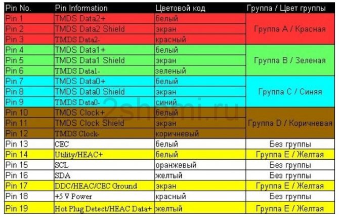 HDMI кабель разбит на 5 групп по 3 жилы. И еще 4 жилы идут отдельно. Разъем обеспечивает коммутацию четырех групп экранированных симметричных цепей для передачи цифровых видеосигналов (экран из алюминиевой фольги), отдельных проводов служебных данных и питания.