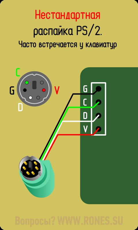 Цвета в шнуре устройства PS/2 могут не соответствовать стандарту. В этом случае обратитесь к статье «Нестандартные цвета PS/2».