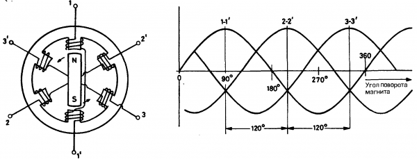 Питание асинхронного электродвигателя происходит от трехфазной сети с переменным напряжением. Такой двигатель, при простой схеме подключения, оснащен тремя обмотками, расположенными на статоре. Каждая обмотка имеет сдвиг друг относительно друга на угол 120 градусов. Сдвиг на такой угол предназначен для создания вращения магнитного поля.